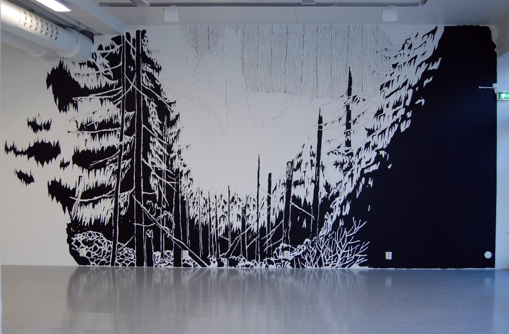 “Svartmalt Furu” / “Pinewood painted black”, Veggmaleri. Fra soloutstilling på Rom8 i Bergen 2010.