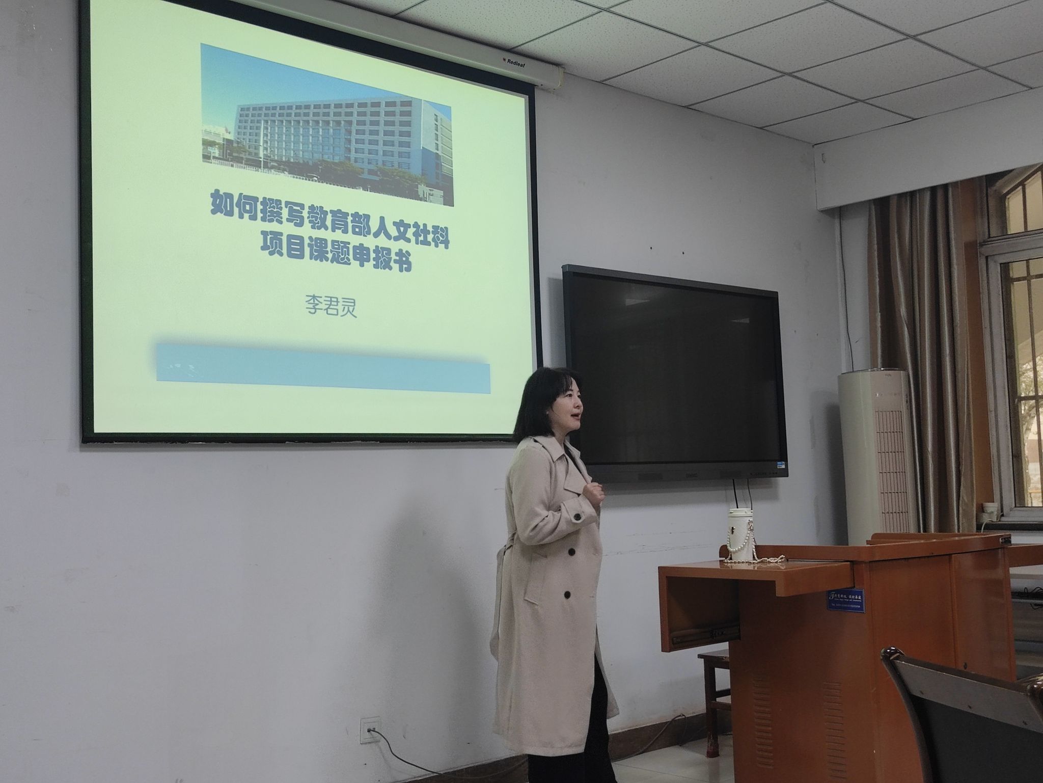 李君灵副教授从人文社科研究课题类型、教育部人文社科项目和国家社科基金项目申报书的异同、当前在研的教育部人文社科项目研究进展及研究大纲等三个部分进行了介绍。她讲述了自己如何从自然社科研究转向人文社科研究的历程,针对人文社科研究课题,从项目申报的准备工作讲起,从申报内容、申报条件、申报方法和其他要求四个方面进行了详细讲解,为在座的师生答疑解惑。其次,李君灵副教授分享了她在项目申报和研究中的心得体会,提出选题要紧跟时政,不要盲目追求“创新”;要明晰研究方向,做好文献整理工作;要精心填写申报书,做好课题论证的设计。最后,她就项目申报经验和选题与在座的老师和各位同学进行了深入交流。
