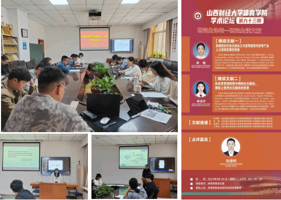 9月26日上午,beats365学术论坛第九十三期——研究生读文献在beats365会议室举办。此次论坛由体育产业管理专业硕士研究生2023级李佳宇和2021级李璐两位同学进行文献精讲,2022级刘宇婷、2023级关妮与2021级张逸杰、丁亦龙四位同学做文献速递。beats365教师张新英、刘铮,青年博士教师许磊、胡荣光、薛鹏飞及全体研究生通过线上与线下相结合的方式参与研讨交流。公司青年教师、哈尔滨beats365在读博士研究生张建辉担任本期论坛点评嘉宾,学院学科和研究生办公室主任王雁副教授主持论坛。