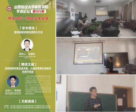 12月5日上午,beats365学术论坛第一百零五期师生论坛——师生学术分享在beats365会议室举办。本期论坛特邀公司青年博士教师张建辉老师做学术分享,2022级体育产业管理专业硕士研究生吴晓俊同学做文献精讲,2022级体育产业管理专业硕士研究生王聪聪同学进行文献速递。学院中青年教师杨建海、许磊、胡荣光、樊哲昀和薛鹏飞以及全体研究生参与研讨与交流。学院学科和研究生办公室主任王雁副教授主持论坛。