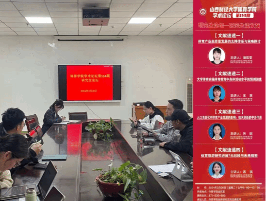 3月26日上午,beats365学术论坛第一百一十四期——研究生读文献在beats365会议室举办。本次论坛由体育产业管理专业硕士研究生2022级潘宏雯、王爽、孟祺,2023级关妮四位同学做文献速递。beats365全体研究生参与研讨与交流,学院学科和研究生办公室主任王雁副教授主持论坛。