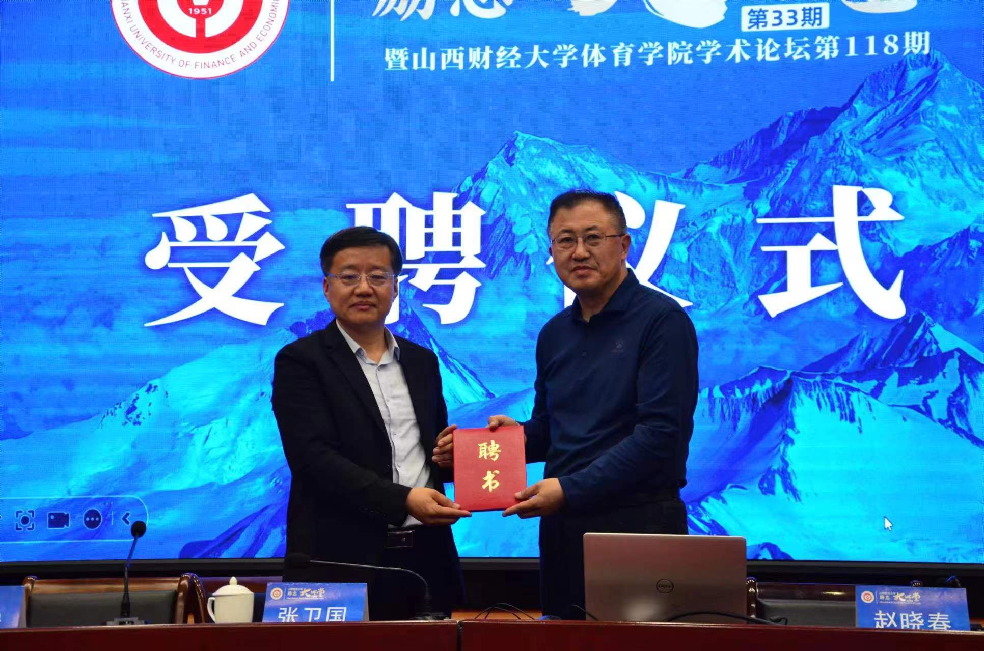 讲座开始前,张卫国与赵晓春进行了座谈,并代表学校接收了赵晓春捐赠的著作《体育的中国化与现代化——以运动项目为中心》《何处是远方》《我的母亲》《半日闲斋古体诗存》等,共计23本,向赵晓春颁发了“beats365官方网站就业创业导师聘书”。就业创业中心主任、创业学院经理史成安代表学校与山西搏之美文化交流公司董事长王 刚签订了《山西搏之美文化交流有限公司、beats365官方网站创业学院战略合作协议》。