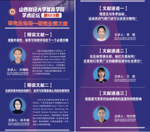 文献速递环节,李璐同学基于冬季户外运动,选取了Knowles等学者发表于期刊International Review for the Sociology of Sport的文章《气候变化与冬季运动:运动员的气候行动可以改变分数吗?》。研究结果表明,冬季运动员的气候行动通常风险较低,同时也害怕被指责为他们的高碳运动和生活方式虚伪,对他们的气候教育水平感到不安全,并对国际和国家级冬季运动组织缺乏气候行动感到沮丧。王爽同学选取了Jonathan Robertson, Rochelle Eime & Hans Westerbeek等学者发表于期刊Annals of Leisure Research的文章Community Sports Clubs: are They only about Playing Sport, or do They Have Broader Health Promotion and Social Responsibilities?对社区体育的主要社会责任进行探讨,及其在促进健康中的位置。何文辉同学汇报了题为“低能量可用率对运动表现的直接和间接影响”,基于运动训练视角探讨低能量对运动表现的影响。
