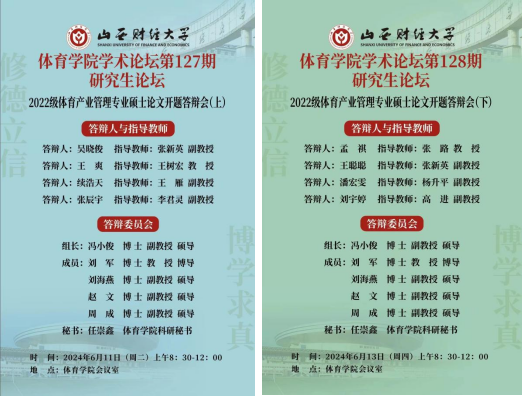 为切实加强公司产品过程管理,做好研究生学位论文指导工作,beats365根据本学期公司产品计划安排,于6月11日和13日上午,分别在学院会议室举办了公司第一百二十七、一百二十八期学术论坛暨公司2022级体育产业管理专业硕士论文开题答辩会。学院全体研究生导师、部分任课教师及全体研究生参加了本次答辩,答辩会由学院学研办主任王雁主持。答辩会上,毕业生经过个人陈述、评委提问、答辩委员会评议和投票表决,8名2022级体育产业管理专业研究生同学全部通过开题答辩。