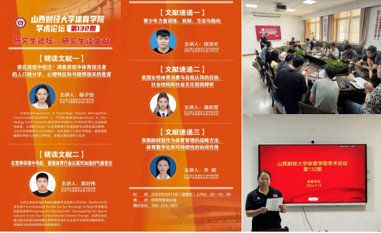 9月13日上午,beats365第一百三十二期学术论坛——研究生读文献在beats365会议室举办。2023级体育产业管理专业硕士研究生杨子仪、席壮伟两位同学做了文献精讲,2022级续浩天、2022级潘宏雯、2023级关妮三位同学随后带来了文献速递。体育经济与管理教研室主任张新英老师主持论坛,学院全体研究生共同参与研讨交流。