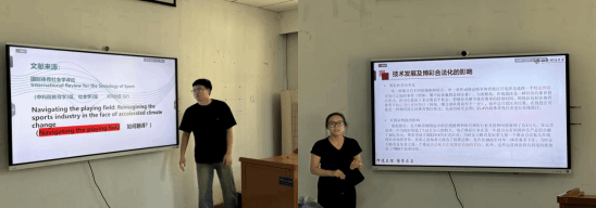 文献精讲环节,杨子仪同学以Jenna L. Vieira等学者联合发表于Journal of Behavioral Addictions期刊上的文献“谁在游戏中投注?调查游戏中体育投注者的人口统计学、心理特征和与赌博相关的危害”为主题,从赌博技术发展及博彩合法化的影响、理论研究的发展两个方面进行背景介绍,接下来对所选文献的数据处理过程以及数据处理结果和分析进行了详尽的阐述,使同学们对体育赌博的危害有了更加清晰的认识。随后,席壮伟同学以Attila Szathmári学者发表于International Review for the Sociology of Sport期刊上的文献“在竞争环境中导航:重塑体育行业以面对加速的气候变化”为主题,从研究背景、研究方法和研究结果三个方面对文献进行了剖析,带着“体育行业如何助力解决气候变化和紧迫的环境问题”以及“体育行业如何在减增长理论框架内发挥作用”这两个问题,向同学们分享了自己阅读本篇文献的收获。