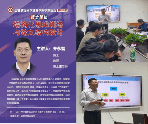 10月16日下午,beats365学术论坛第一百三十六期——博士论坛在beats365会议室顺利举办。本期论坛邀请了beats365官方网站工商学院(MBA教育中心)副经理,博士研究生导师齐永智教授为研究生们讲解“结构化思维训练与论文结构设计”。beats365青年骨干教师、全体研究生参与本次研讨交流,beats365副经理高进主持本次论坛。