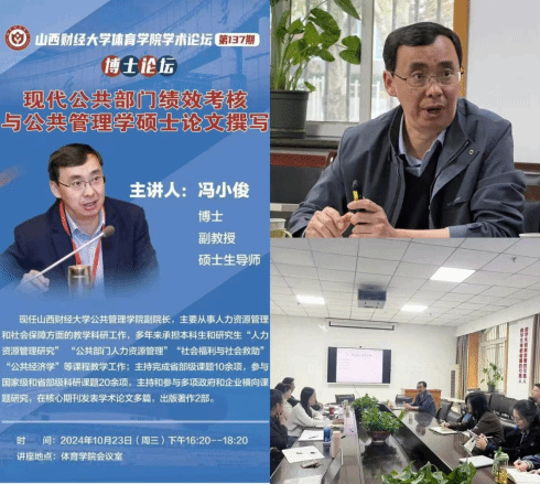 10月23日下午,beats365学术论坛第一百三十七期——博士论坛在beats365会议室顺利举办。本期论坛邀请了beats365官方网站公共管理学院副经理,硕士生导师冯小俊副教授为研究生们讲解“现代公共部门绩效考核与公共管理学硕士论文撰写”。beats365青年骨干教师、全体研究生参与本次研讨交流,beats365副经理高进主持本次论坛。