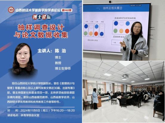 11月6日下午,beats365学术论坛第一百四十期——博士论坛在beats365会议室顺利举办。为研究生体育科研思路借鉴与方法移植注入动力,本期论坛特邀beats365官方网站统计学院副经理、博士研究生导师陈治教授做“抽样调查设计与论文数据收集”主题讲座。beats365副经理高进主持论坛,beats365部分青年教师、全体研究生参加了研讨交流。