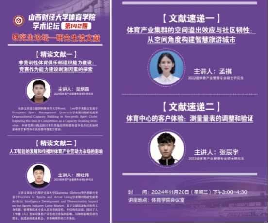 11月20日下午,beats365学术论坛第一百四十二期——研究生读文献在beats365会议室举办。体育产业管理专业2024级吴炳霖、2023级席壮伟两位同学为大家汇报文献精讲,2022级孟祺、张辰宇两位同学进行文献速递。学院全体研究生共同参与研讨交流,学院学科和研究生办公室主任王雁副教授主持论坛。