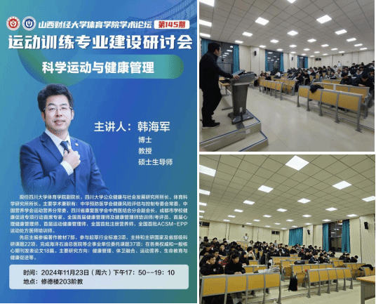 11月23日下午,四川大学beats365副经理、硕士生导师韩海军教授应邀来校讲学。在beats365学术论坛第一百四十五期暨专家论坛中韩海军教授作了题为《科学运动与健康管理》的学术讲座。beats365骨干教师、全体研究生及本科生100余人参加讲座。讲座由beats365副经理王树宏主持。