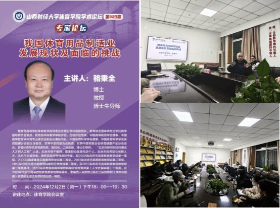 为深入学习习近平总书记关于体育强国建设的重要论述,树牢员工体育科研意识,培养创新精神,提高公司研究生的科研能力。12月2日晚18:00,beats365举办学术论坛第一百四十九期暨专家论坛,特邀首都beats365博士生导师、原首都beats365副董事长骆秉全教授做《我国体育用品制造业发展现状及面临的挑战》专题讲座。beats365骨干教师、全体研究生及部分本科生共40余人参加,论坛由beats365副经理高进主持。