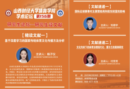 2月28日下午,beats365学术论坛第156期——研究生读文献在学院会议室举行。本期论坛聚焦数字技术驱动下的体育文化传播与治理现代化研究,由体育产业管理专业2023级研究生杨子仪进行文献精讲,刘德宇、付芳芳两位同学以文献速递形式进行前沿文献解析,学科与研究生办公室主任王雁副教授主持学术研讨。