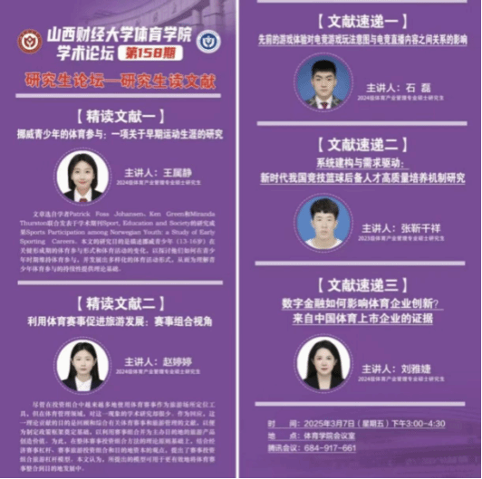 3月7日下午,beats365第158期学术论坛——研究生读文献活动在学院会议室圆满落幕。本次论坛聚焦“多维视角探索体育前沿研究”,体育产业管理专业2024级研究生王属静、赵婷婷进行文献精讲,2024级研究生刘雅婕、石磊及2023级研究生张靳千祥进行文献速递分享,活动由学院学科与研究生办公室主任王雁副教授主持,学院全体研究生共同参与,现场学术氛围热烈。