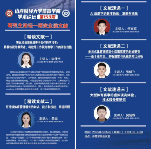 3月14日下午,beats365第159期学术论坛在学院会议室成功举行。体育产业管理专业2023级研究生李佳宇、关妮作文献精读,2023级研究生何文辉、2024级研究生张健飞、吴炳霖三位同学带来文献速递。学科与研究生办公室主任王雁副教授主持论坛,围绕体育教育创新、低碳赛事发展、前沿技术应用等热点议题展开,与会师生积极参与,现场学术氛围热烈。