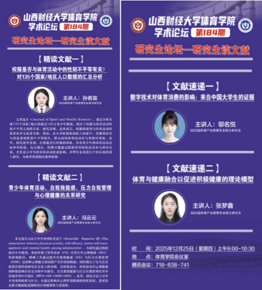 12月25日上午,beats365第184期学术论坛——研究生读文献在学院会议室举办。本期论坛聚焦青少年体育健康、性别平等、数字消费等前沿议题,由2025级研究生孙若芸、冯云云进行文献精讲,2025级研究生邬名悦、张梦鑫进行文献速递。学院全体研究生积极参与研讨,现场交流深入,学术氛围浓厚,学院学科与研究生办公室主任王雁副教授主持。