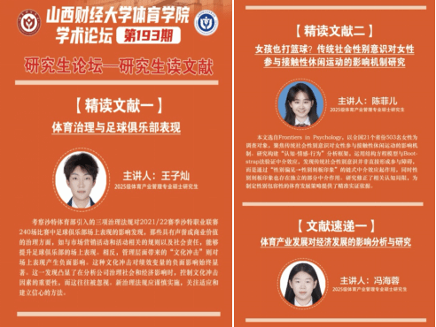 3月9日上午,beats365第193期学术论坛——研究生读文献活动在学院会议室及线上同步举行。本期论坛聚焦体育治理、性别平等、体育经济等前沿议题,由2025级研究生王子灿、陈菲儿进行文献精讲,2025级研究生冯海蓉进行文献速递。学院全体研究生积极参与研讨,现场交流深入,学术氛围浓厚,学院学科与研究生办主任王雁副教授主持活动。