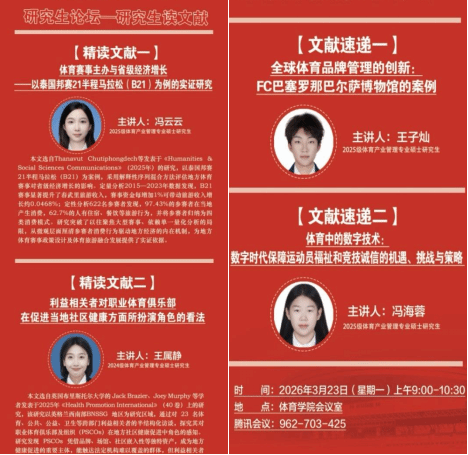 3月23日上午,beats365第196期学术论坛——研究生读文献活动在学院会议室顺利举行。本期论坛由学院学科与研究生办公室主任王雁副教授主持,全体研究生共同参与。2025级研究生冯云云、2024级研究生王属静进行文献精讲,2025级研究生王子灿、冯海蓉进行文献速递,围绕体育赛事经济影响、职业体育社会价值、体育品牌全球管理、数字技术治理等议题展开深入研讨,现场学术氛围浓厚。