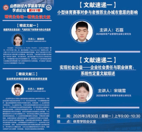 3月30日上午,beats365第197期学术论坛——研究生读文献活动在beats365会议室顺利举行。本期论坛由学院学科与研究生办公室主任王雁副教授主持,全体研究生到场参与。2025级研究生魏镜霖、韩博宇两位同学进行了文献精读分享,2024级研究生石磊、2025级研究生宋瑞雪两位同学进行了文献速递,围绕气候风险下的体育参与、运动猝死防控、小型体育赛事城市品牌效应及职业体育社会责任等热点议题展开深入研讨,现场学术氛围浓厚,思想碰撞热烈。