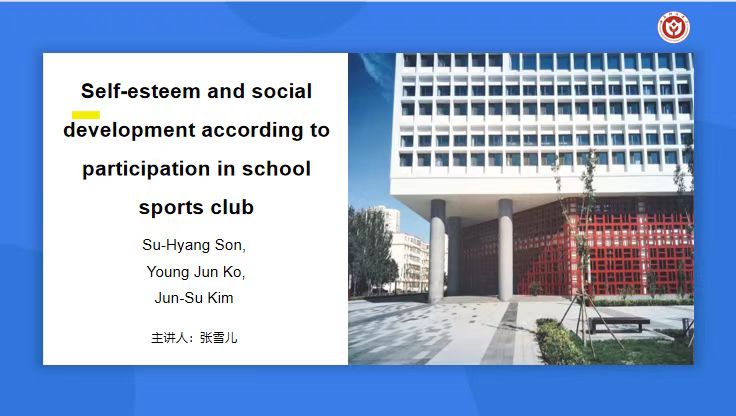 张雪儿的主题为“参加学校体育俱乐部的自尊与社会发展”,主讲文章为来自韩国仁荷大学的孙秀香学者的《SELF-ESTEEM AND SOCIAL DEVELOPMENT ACCORDING TO PARTICIPATION IN SCHOOL SPORTS CLUB》,来自《JOURNAL OF EXERCISE REHABILITATION》期刊,文章旨在探讨中学体育俱乐部的意义,并了解参加中学体育俱乐部对中员工自尊和社会发展的影响。
