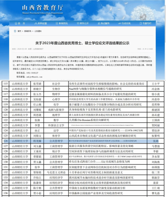 日前,山西省教育厅公布《关于2023年度山西省优秀博士、硕士学位论文评选结果》,公司2020级体育产业管理专业硕士研究生程茂滕毕业论文《数字经济驱动体育旅游产业高质量发展的作用机理与实证检验——以黄河流域为例》(硕士生导师:张路)获评2023年度山西省优秀硕士学位论文,此前,该论文已获评2023年度beats365官方网站优秀硕士学位论文。