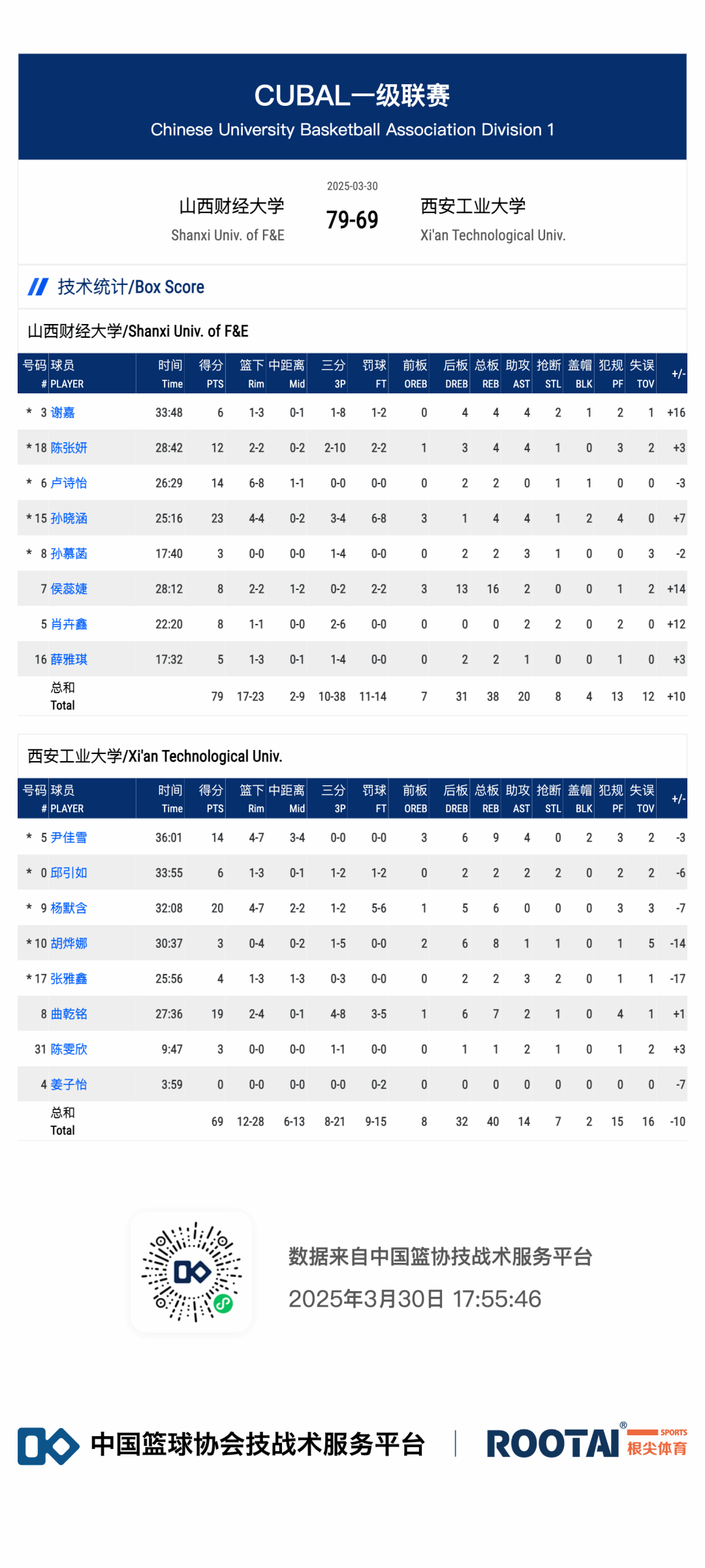 山西财大:孙晓涵23分4板4助,卢诗怡14分2板,陈张妍12分4板4助,侯蕊婕8分16板2助,谢嘉6分4板4助2断,肖卉鑫8分2助2断
