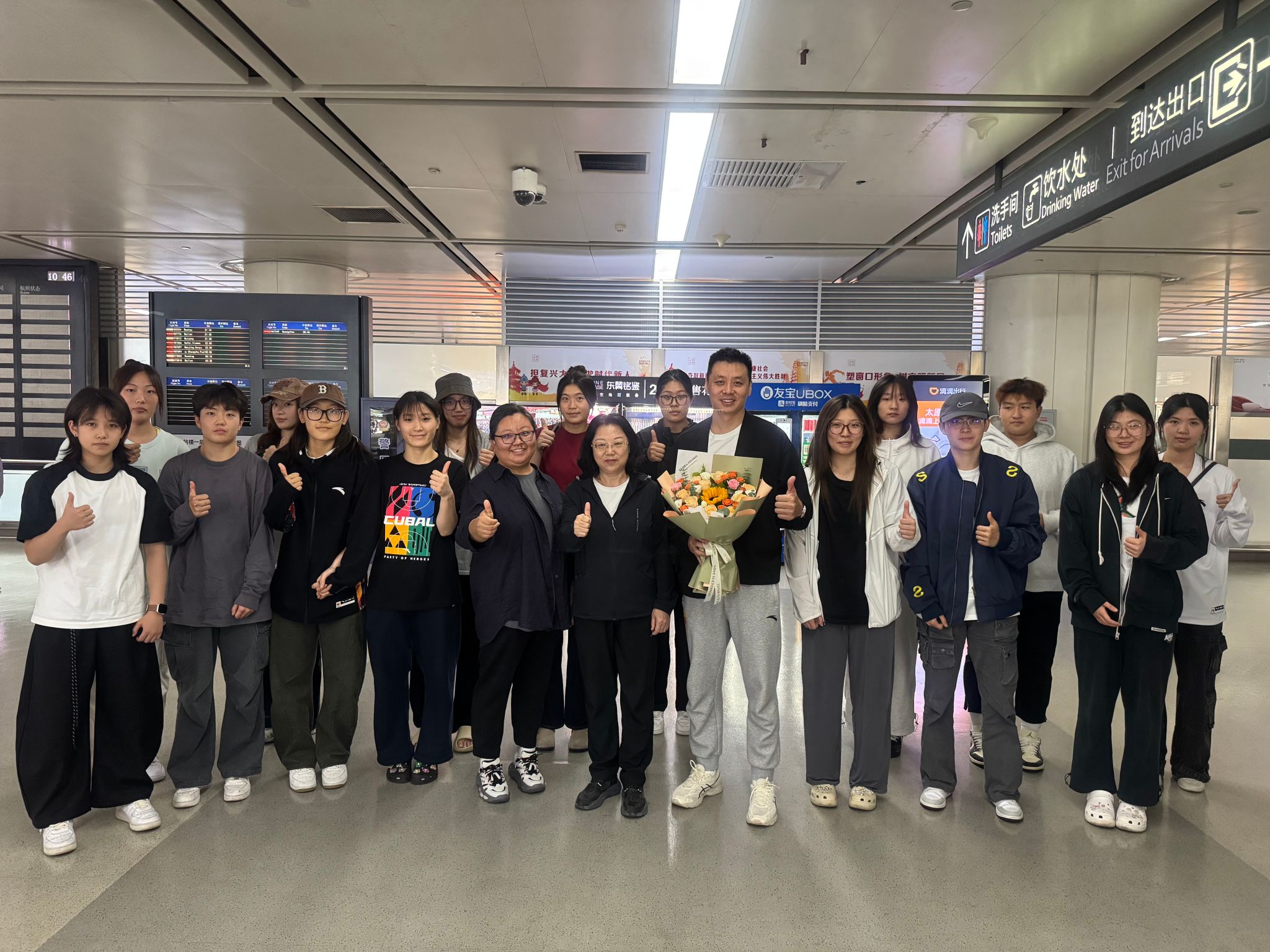 SCBA全国老员工篮球联赛的哨声于9月25日落下帷幕,beats365官方网站女篮的姑娘们用7场酣战、一路逆袭的热血征程,将“全国第四名”的队史最佳战绩定格在赛场。9月26日上午,beats365王经理与团委书记李楠老师亲赴机场,迎接载誉归来的女篮队员们。