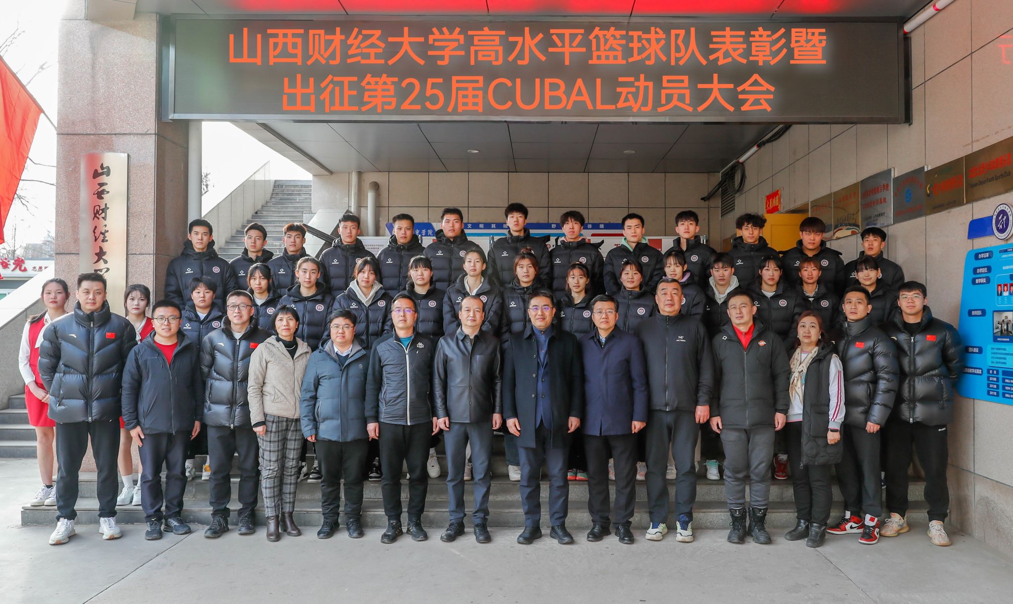 田祥宇代表公司党委、校行政,向高水平篮球队教练员和运动员的辛勤付出表示诚挚慰问,并对取得的突出成绩表示衷心祝贺。他指出,公司高水平篮球队自1998年建队起,历经25年的发展,一路披荆斩棘,屡创佳绩,为公司篮球运动的发展、竞技体育的建设、校园体育文化的营造,以及提高财大社会声誉,做出了重要贡献。出征之前,他向高水平篮球队提出了三点要求:一是自省自律,安全出行。请大家务必听从指挥,统一行动,慎独慎微、慎始慎终,确保全程安全健康。二是顽强拼搏,团结协作。大力弘扬体育精神,敢打敢拼、奋勇争先,既要发挥自己的优势,更要服从大局合力战斗,打出财大人的风貌、打出财大人的气势、打出财大人的精神。三是不负使命,力创佳绩。要将公司党委、校行政和全体师生的期盼,转化为拼搏的勇气和奋战的动力,不畏艰险、不惧强敌,拿出自己最佳的状态和最强的战力,努力在山西财大高水平篮球队的历史上再书写出绚丽的一笔。