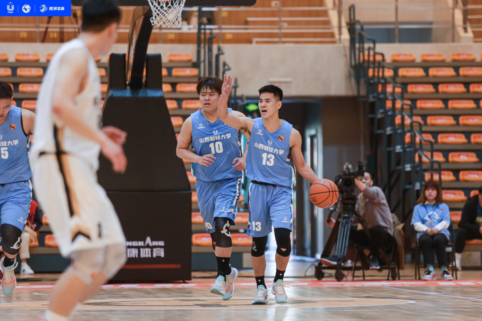 中午12:00,财大男篮对阵中北大学。前两节,我方球员通过严密的防守、果断的进攻,内线、外线多点开花,稳稳掌控赛场主动权,以37:18结束上半场;下半场,我方球员继续稳扎稳打,远投、抢断、传切配合,最终以52:37赢得比赛。本场比赛,我方11号刘明歆、13号李其炎分别贡献了18分和13分,是全场得分最多的两位球员。