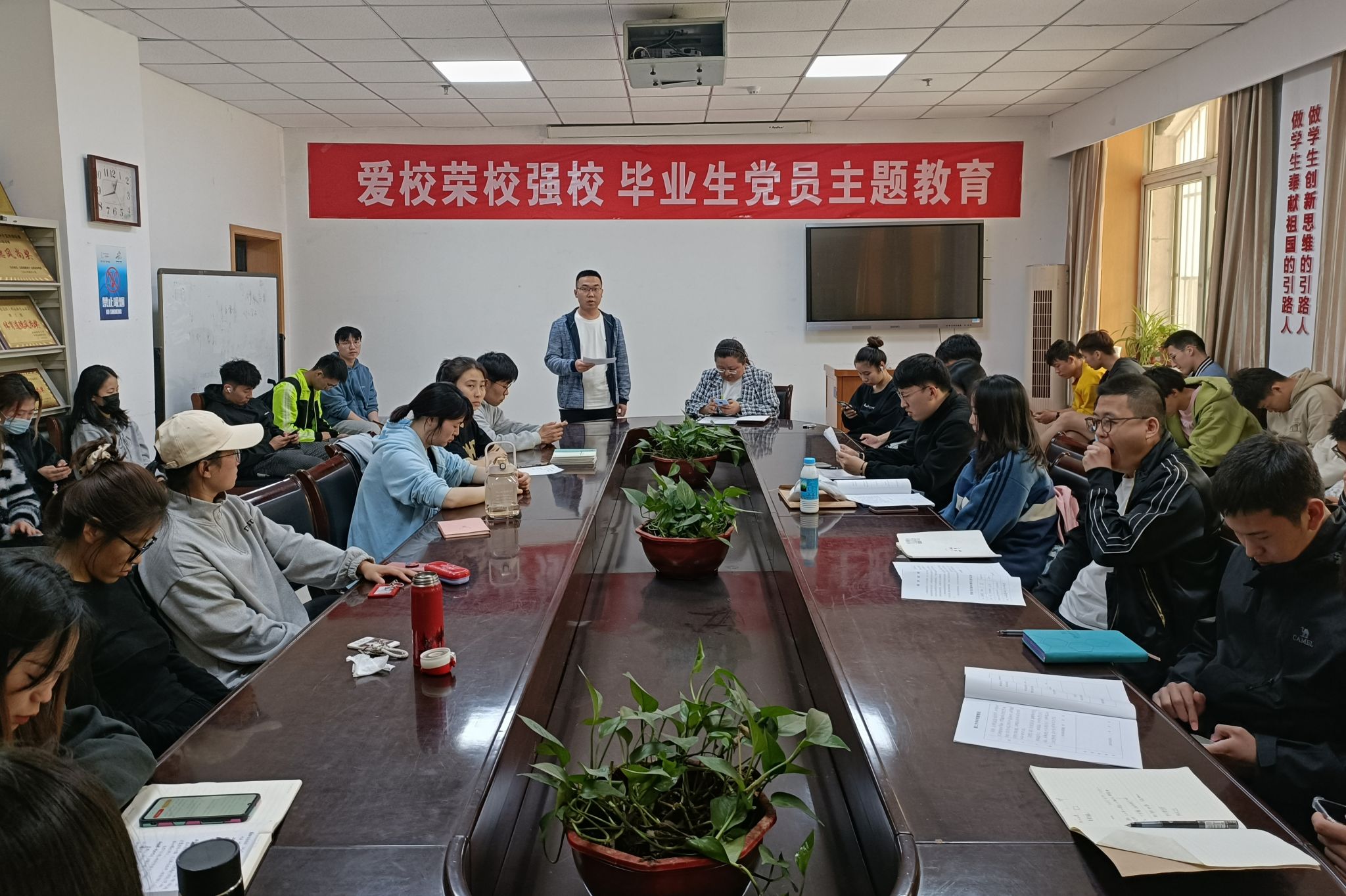 党支部书记李楠对毕业生党员们进行了“爱党爱校、荣校强校”的专题教育,希望毕业生党员无论走到哪里,都牢记“修德立信 博学求真”校训精神,在新的学习与工作岗位上,锤炼品德,勇于创新,踏实奋斗,自觉承担起新时代青年的责任与担当;要牢记党员身份,严守党的纪律律,永葆清正廉洁的政治品质。临近毕业,员工党员要发挥好模范带头作用,站好最后一班岗,团结带领全体毕业生做好离校工作。毕业生党员们在会上畅所欲言,分享大学四年的变化与故事,向老师们表达了感激之情,向母校表达了感恩之情,互相分享了各自的心得。2019级体育经济与管理1班党员刘政德谈到:“4月29日是母校的生日,作为财大人,无论走到哪里,都要记住这一天,作为毕业生党员,要切实做到知史爱校,做传承光辉校史的财大人;行动爱校,做投身校园建设的财大人;奋斗荣校,做新时代奋进的财大人。”
