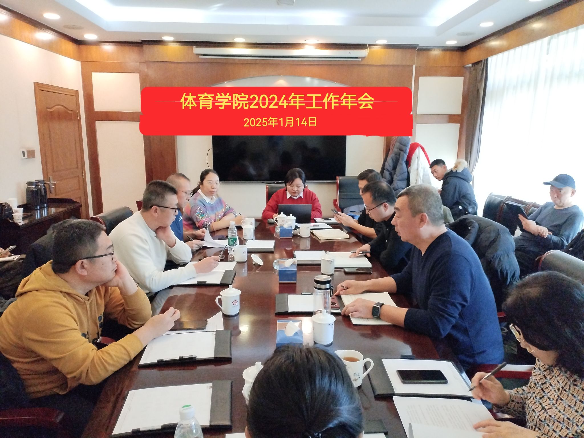 公司领导对过去一年大家的辛勤付出和取得的成绩给予肯定,强调了 2025 年工作目标的重要性与紧迫性。各科室支部书记、负责人,全体博士、高水平运动队教练员依次发言,简要总结了2024年工作,重点围绕各自科室的职责与 2025 年工作目标,展开了详细深入的汇报。与会人员就党风廉政建设、清廉校园建设、意识形态工作、安全稳定、党支部建设、学科与专业建设、一流课程打造、科学研究、思政教育、学风建设、高水平运动队建设等方面,对标 2025 年具体工作任务,细化路线图,明确完成各项指标的时间节点和进度,完成“命题作文”,立好“军令状”。