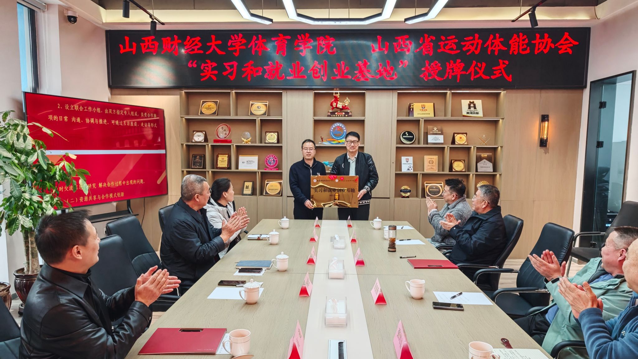 在座谈环节,双方围绕战略合作内容展开深入探讨。从联合开展运动体能科研项目,到共同制定人才培养方案;从为员工创造更多实践机会,到携手举办各类体育赛事,大家各抒己见,积极交流想法。双方一致认为,此次合作是一次强强联合、优势互补的良好契机,不仅能为山西省运动体能领域带来全新的发展机遇与变革,也将为双方在人才培养、科学研究、社会服务等方面开辟更为广阔的发展空间。随后,举行了战略合作框架协议签订 仪式和“beats365实习和就业创业基地”授牌仪式。