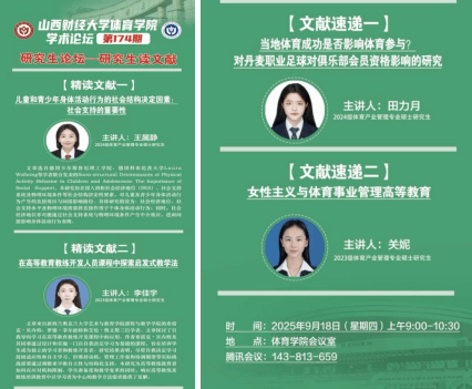 在文献速递环节,2024级研究生田力月介绍了《当地体育成功是否影响体育参与?对丹麦职业足球对俱乐部会员资格影响的研究》,从实证角度分析职业体育成绩对大众体育参与的带动作用,为相关体育政策制定提供了参考。2023级研究生关妮就《女性主义与体育事业管理高等教育》进行分享,探讨女性主义视角在体育管理教育与职业发展中的意义,呼吁加强性别平等与多元包容的教育实践。