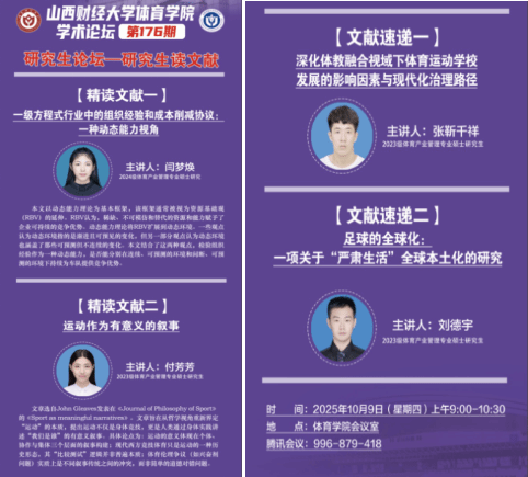 10月9日上午,beats365学术论坛第176期——研究生读文献在beats365会议室举办。本期论坛由体育产业管理专业2024级研究生闫梦焕、2023级研究生付芳芳进行文献精讲,2023级研究生张靳千祥、2023级研究生刘德宇进行文献速递,学院全体研究生参与研讨,学院学科和研究生办公室主任王雁副教授主持论坛。