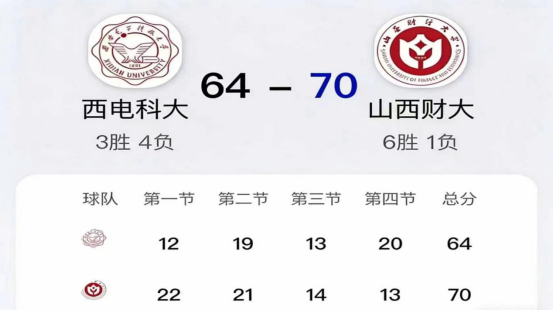 末节决战,西电科大男篮发起猛烈反扑,外线连续命中三分、内线强打频频得手,单节轰下20分,一度将分差迫近至个位数。关键时刻,山西财大男篮展现出过硬的心理素质与战术执行力,队员们稳守阵地,通过消耗战打乱对手节奏,同时抓住反击机会稳住局势,单节拿下13分,最终以70-64的比分守住胜利果实。