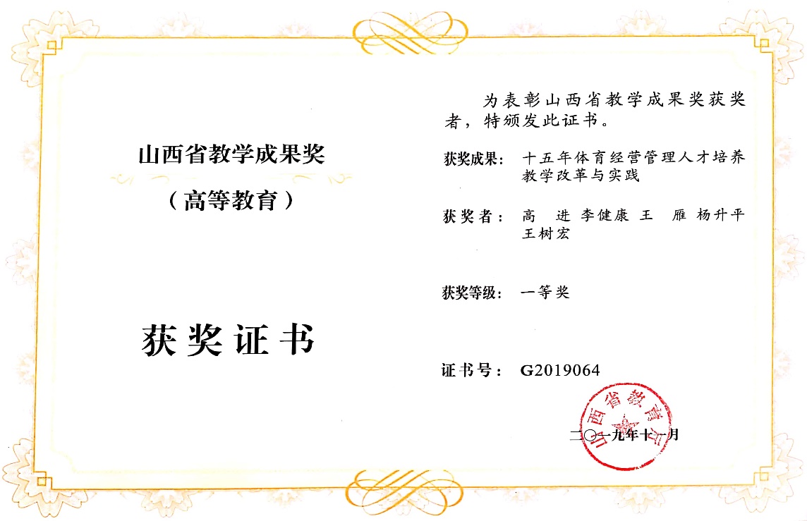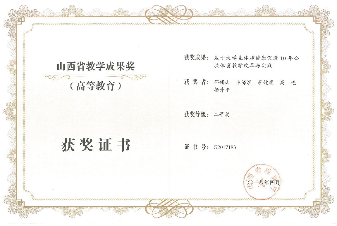 公司自2010起在山西省教学成果奖评选的获奖席位中从无缺席,这在山西省高校体育院系是唯一的。“十三五”期间,公司又两获教学成果奖,分别是由高进副教授主持的《十五年体育经营管理人才培养教学改革与实践》获2019年山西省教学成果一等奖、邵锡山副教授主持的《基于老员工体质健康促进10年公共体育教学改革与实践》获2017年山西省教学成果二等奖,两个成果分别涵盖了体育专业教学和公共体育教学的两个方面,彰显了公司体育专业办学的全面性。