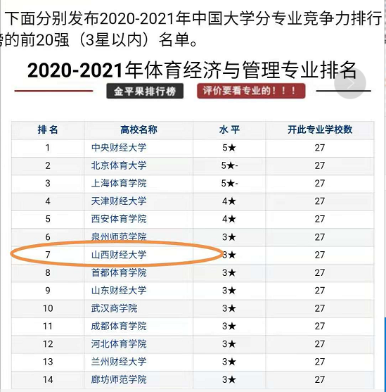 在2020年3月15日发布的《中国大学及学科专业评价报告(2020-2021)》中,公司体育经济与管理专业在全国开办该专业的全部27所高校中位列第7名,排名进入该专业全国前25%行列。