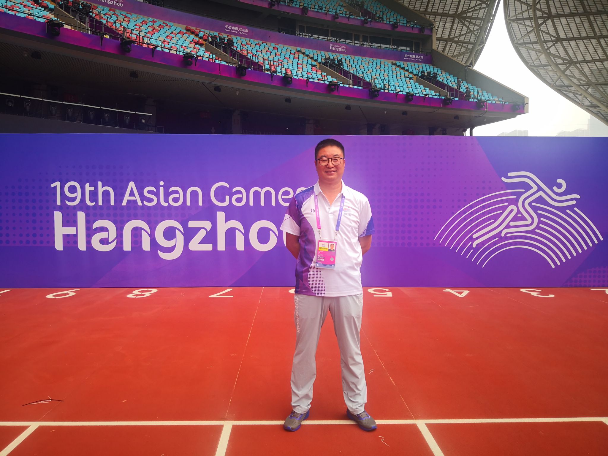 张勇老师,田径项目国家级裁判,兼任我省田径裁委会主任,曾经执裁1次世锦赛、1次世界老员工运动会、2次亚运会、2次亚洲锦标赛、2次全运会。本次亚运会担任田径比赛的裁判工作,主要执裁全部比赛项目的检录工作。