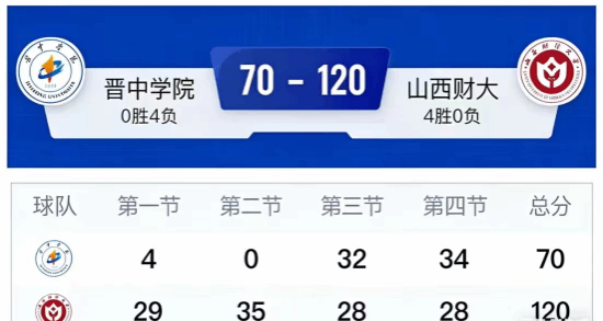 末节比赛,山西财大女篮在确保胜局的前提下,继续保持进攻火力,单节再得 28 分;晋中学院队也在进攻端找回状态,单节得到 34 分。最终全场比赛结束,山西财大男篮以 120-70 的比分完胜对手,顺利拿下四连胜。